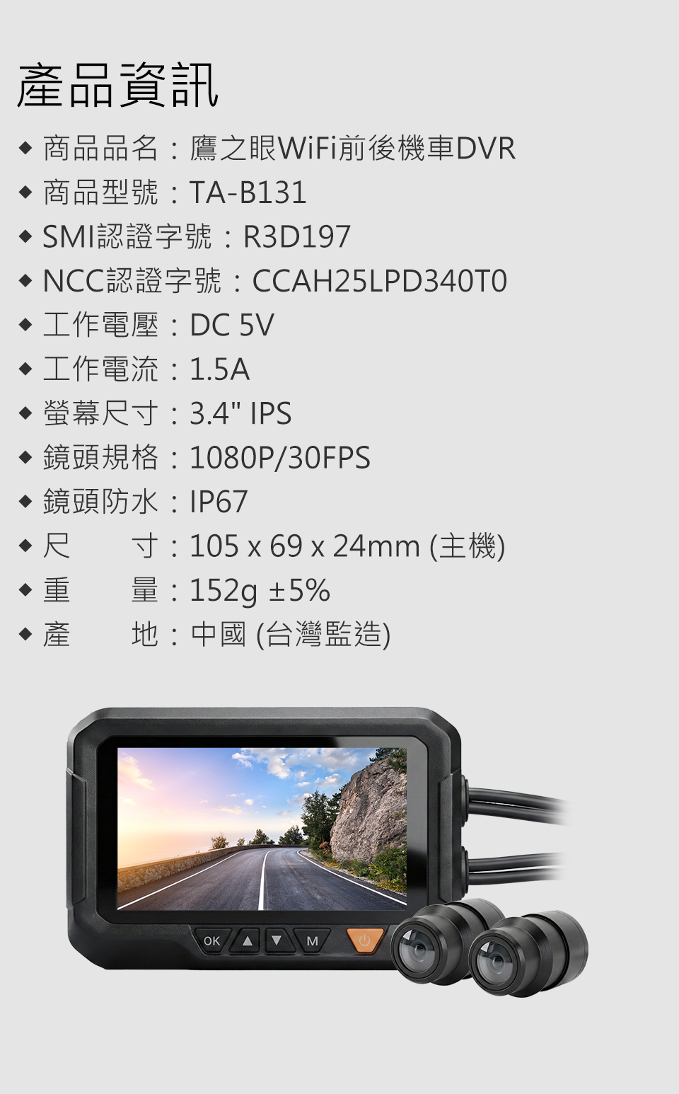 商品品名:鷹之眼WiFi前後機車DVR